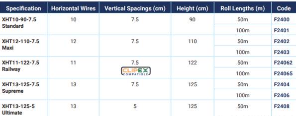 Specification Horizontal Wires Vertical Spacings (cm) Height (cm) Roll lengths (m) Code XHT10-90-7.5 Standard 10 7.5 90 50 + 100 F2400 / F2401 XHT12-110-7.5 Max 12 7.5 110 50 +100 F2402 / F2403 XHT11-122-7.5 Railway 11 7.5 122 50 + 100 F24062 / F24065 XHT13-125-7.5 Supreme 13 7.5 125 50 + 100 F2404 / F2406 XHT13-125-5 Ultimate 13 5 125 50 + 100 F2408 -